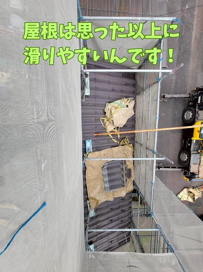 屋根の上は見た目以上に滑りやすく、特に瓦を外した直後は足元の状態が変わりやすい場所。